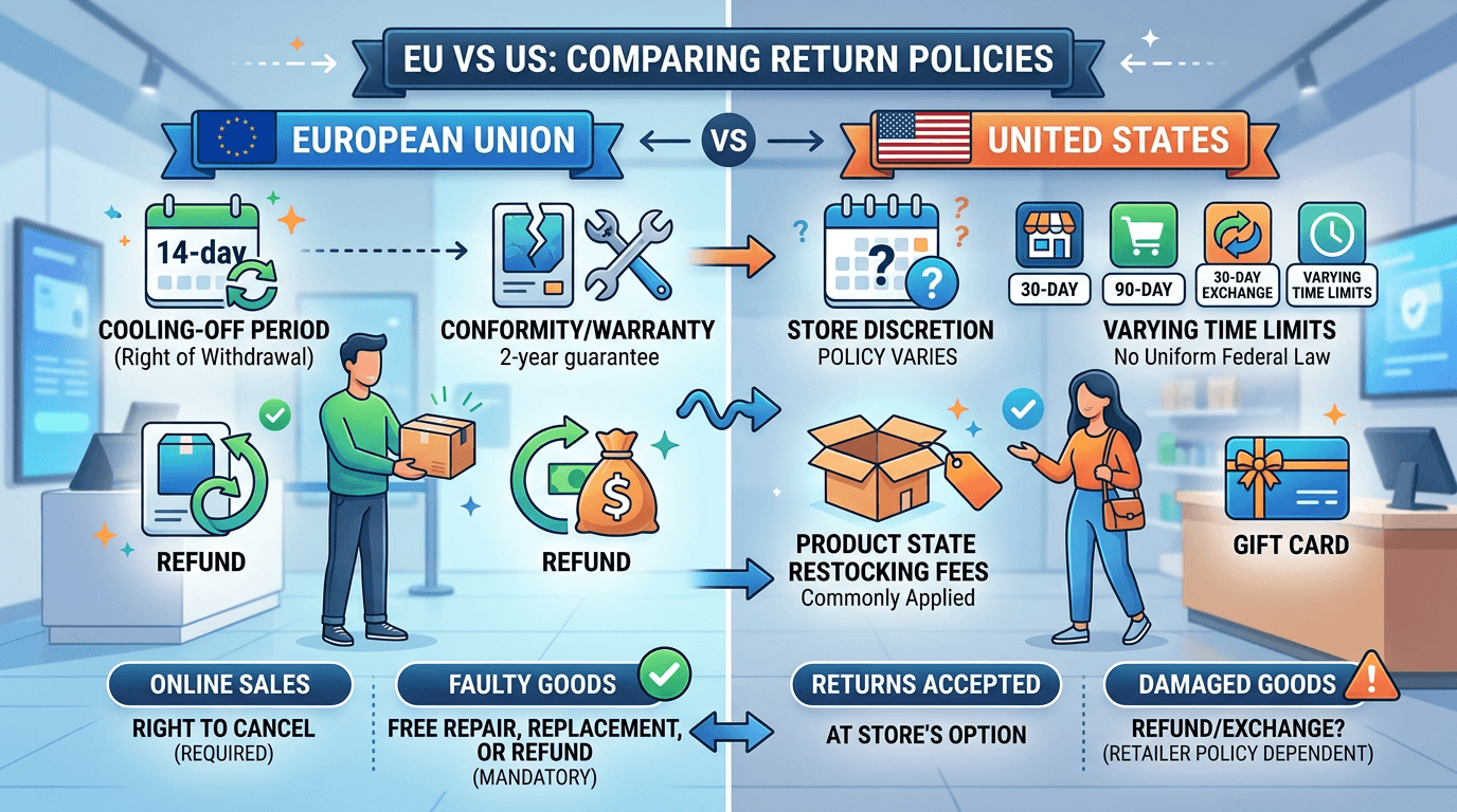 עסקים הפועלים הן באיחוד האירופי והן בארה"ב נדרשים לנווט בין שתי מערכות חוקים שונות. יישום מדיניות החזרות אחידה שאינה מותאמת עשויה להיות בעייתית: